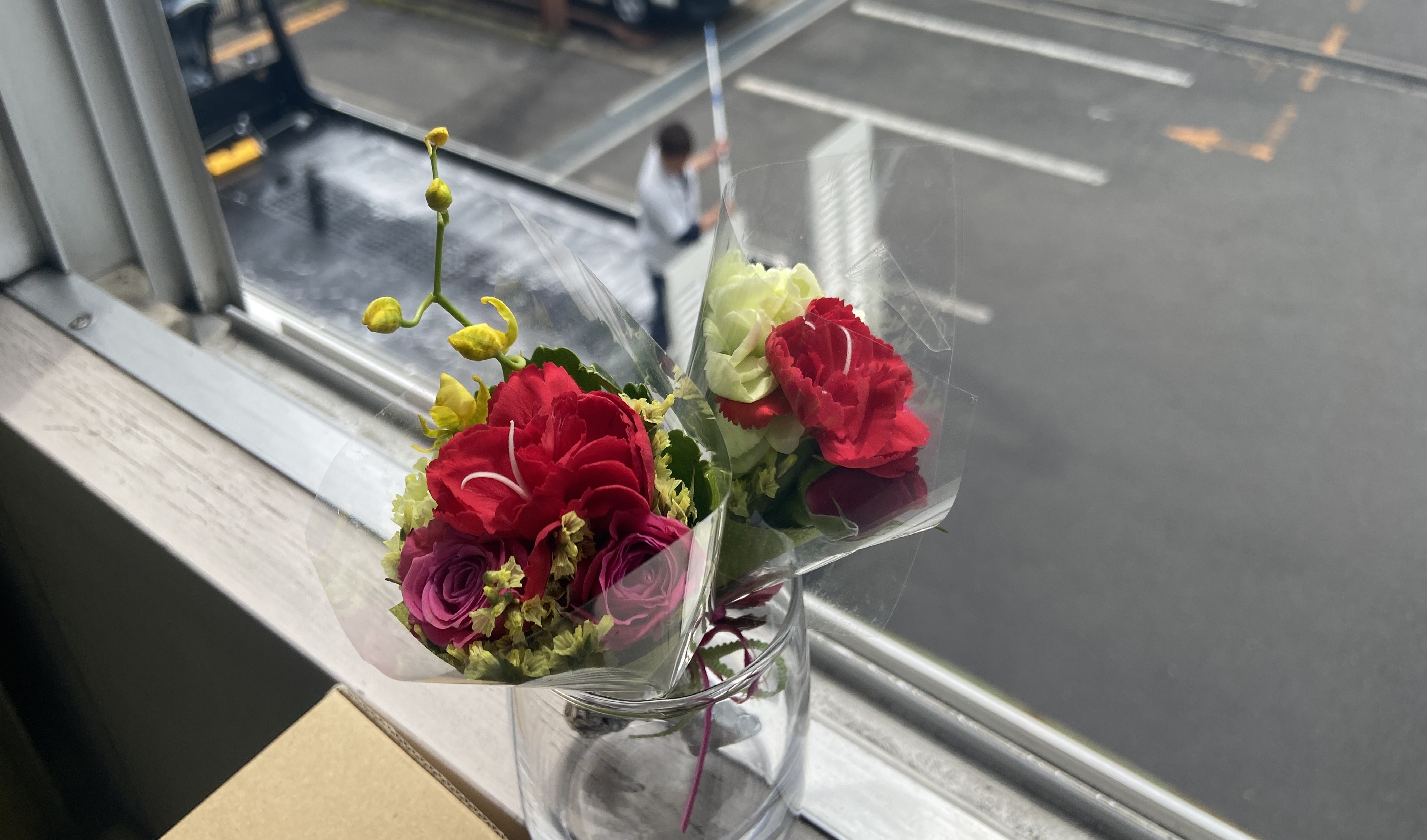 母の日(5月8日)に事務員さんが娘から綺麗なお花のプレゼントを頂いたそうです。あまりに綺麗なお花でしたのでトラックの洗車をしているドライバーさんを背景に撮影しました。